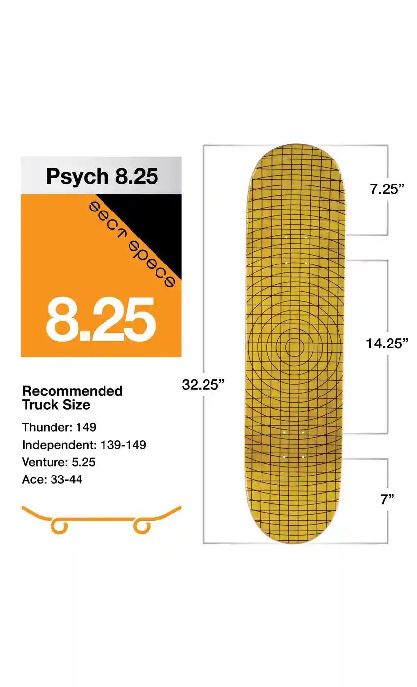 8.25 inch wide, 32.25 inch long, 14.25 inch wheelbase, 7.25 inch nose, 7.0 inch tail.