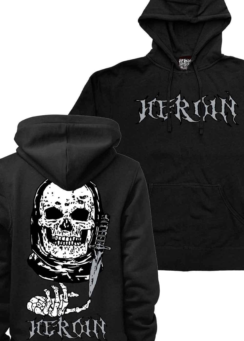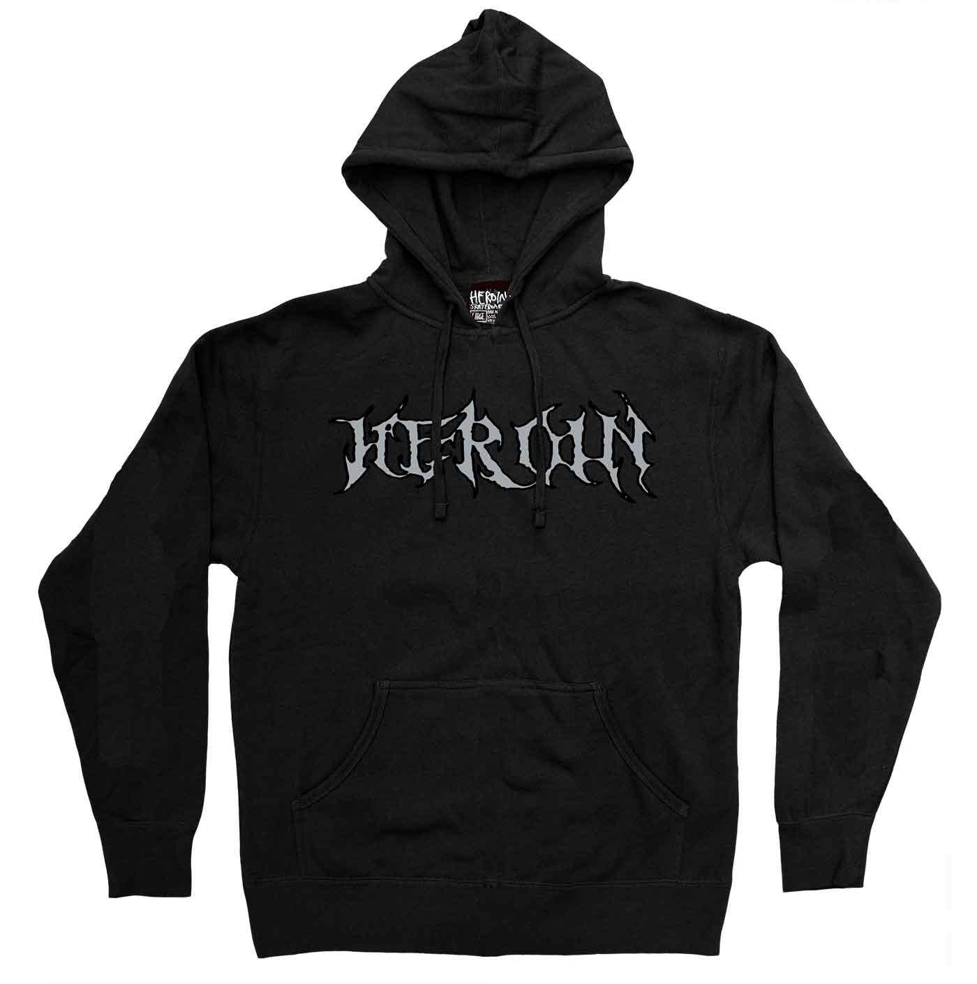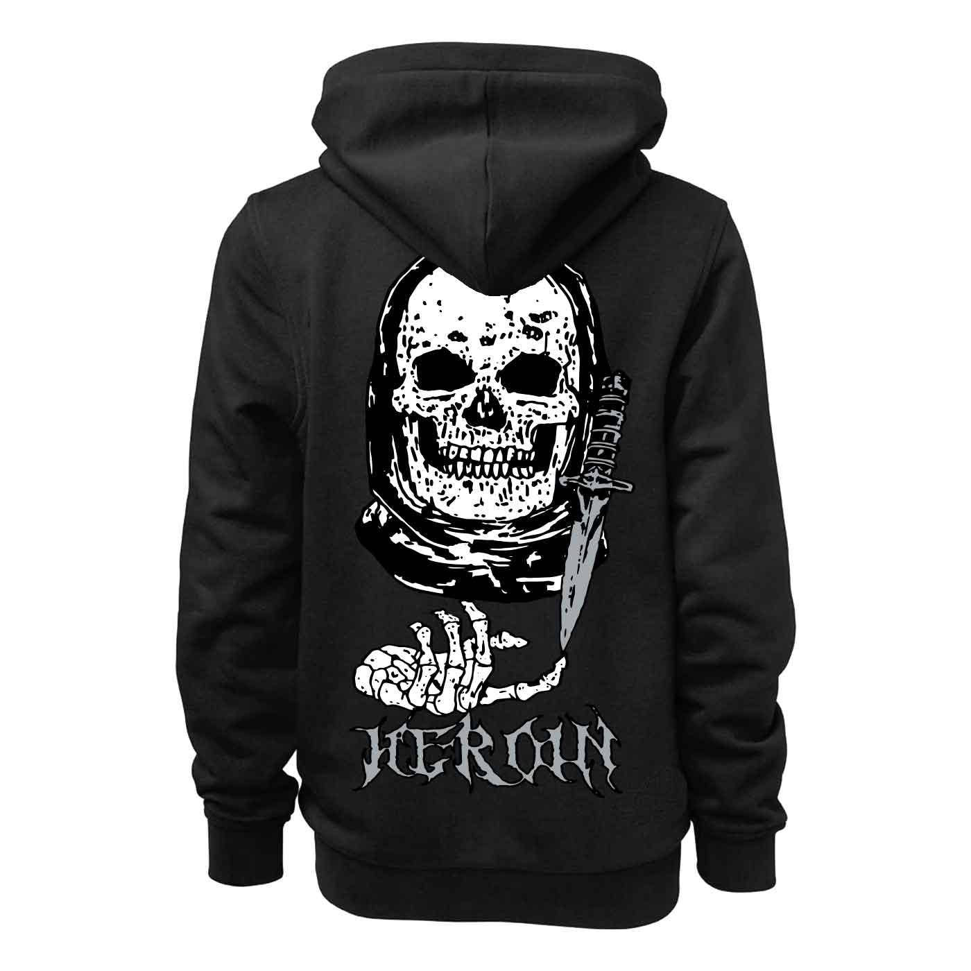 The Video City Skull is a black premium hooded pullover sweater by Heroin Skateboards